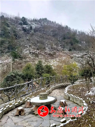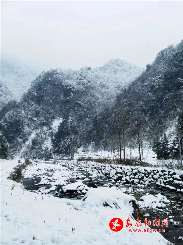 愈往深山走去,愈是銀裝素裹。發(fā)如雪,天作襯。色彩在這里失去了顏色,整個(gè)世界只剩下黑與白的構(gòu)圖。山澗中露出的黑巖,連綿著,將青絲的線條起伏蜿蜒地勾勒而出。山腳下一排排整齊的村民安置房,已顯出冬眠酣睡的樣子。樹林里帶著一層朦朧,在群山連綿中起伏著,為這雪天獻(xiàn)上了一幅絕美的水墨畫卷,也更增加了幾分神秘。
