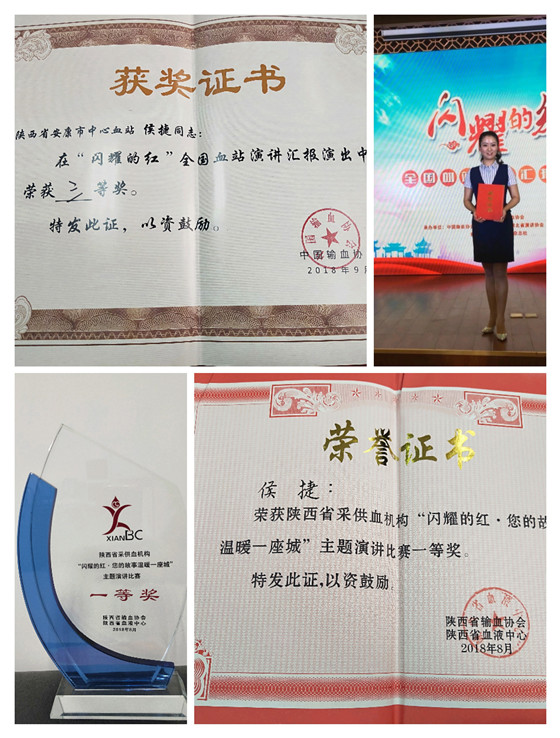 我站血源管理科侯捷同志,根據(jù)自己血站崗位工作成長經(jīng)歷,結(jié)合血源一線招募典型事例,充分展示安康無償獻(xiàn)血招募宣傳模式,以“成長在生命年輪中的信仰”為題,代表安康市中心血站參加陜西省“閃耀的紅--您的故事溫暖一座城”血站系統(tǒng)演講比賽,以獨特的視角和演講效果奪得冠軍,并選派于9月21日代表陜西省采供血行業(yè)參加“閃耀的紅”全國血站演講比賽榮獲三等獎,是我站首次在全省、全國演講比賽中取得的最佳成績,為我站在全國范圍內(nèi)贏得了榮譽,為安康、陜西血站行業(yè)系統(tǒng)爭了光,在全國血液行業(yè)內(nèi)展示了我站職工昂揚向上的精神風(fēng)貌。