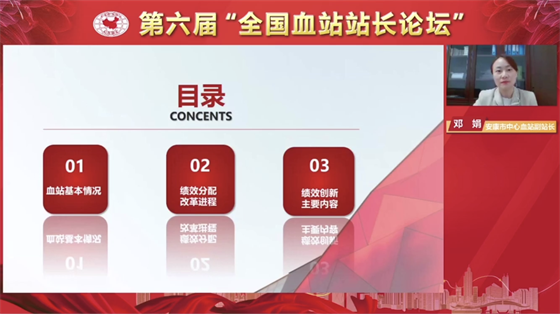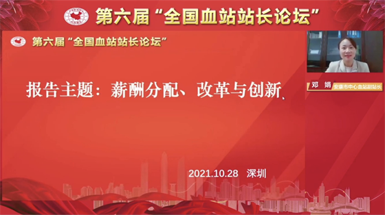 為加強全國血站的經(jīng)驗交流與合作,2021年10月27日至28日,第六屆 “全國血站站長論壇”在深圳市舉辦。中國輸血協(xié)會理事長、世界衛(wèi)生組織輸血合作中心主任朱永明,深圳市衛(wèi)健委二級巡視員林漢城等相關領導出席并致辭。此次論壇的主題是“血站建設與發(fā)展、改革與創(chuàng)新”,來自全國各省、市血液中心(血站)的同仁通過線上方式參加會議。安康市中心血站副站長鄧娟作為全國血站六個優(yōu)秀論文交流發(fā)言人之一,就安康血站績效分配、改革與創(chuàng)新工作在會上進行了經(jīng)驗交流。