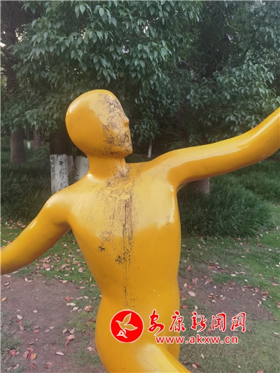 五一期間,安康高新區(qū)運動公園內,一處運動塑像遭人“抹黑”,污跡斑斑,有礙觀瞻。(記者 許安)?