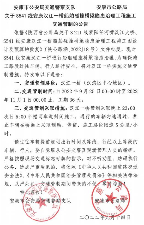 9月25日至11月1日安康漢江一橋?qū)⑦M行船舶碰撞橋梁隱患治理工程施工,將對漢江一橋?qū)嵭?strong>交通管制36天,管制采取晚上23:00-次日5:00半幅兩車道封閉施工,通行的車輛勻速通過,禁止車輛在橋梁上采取制動、停留,施工路段限速5公里/小時。