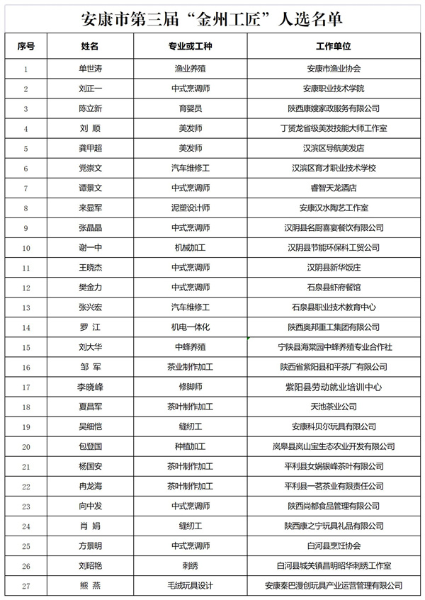 附件:安康市第三屆“金州工匠”人選名單
