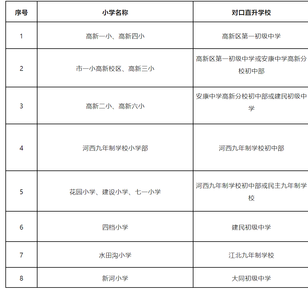四、安康高新區(qū)2023年小升初對口直升一覽表