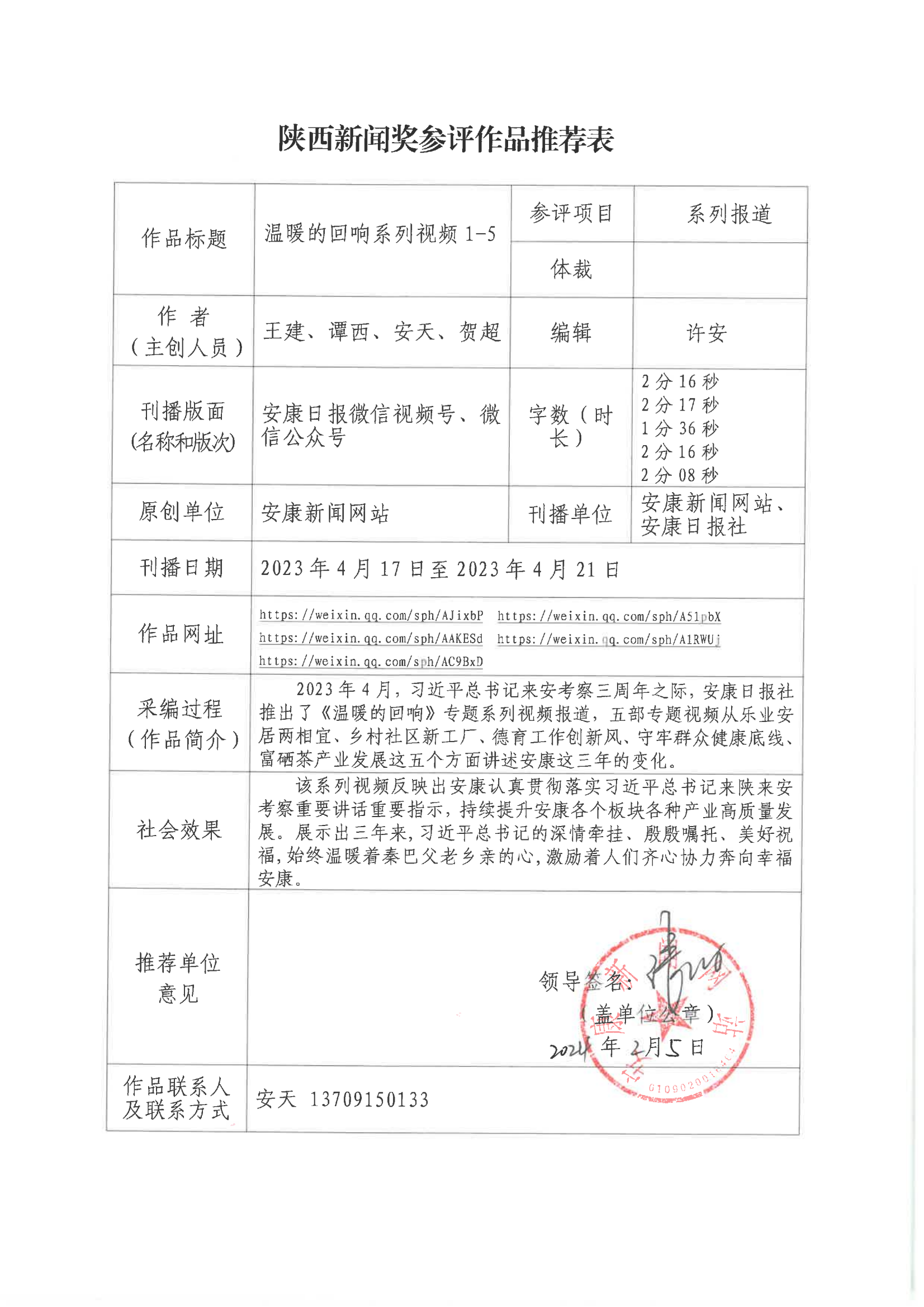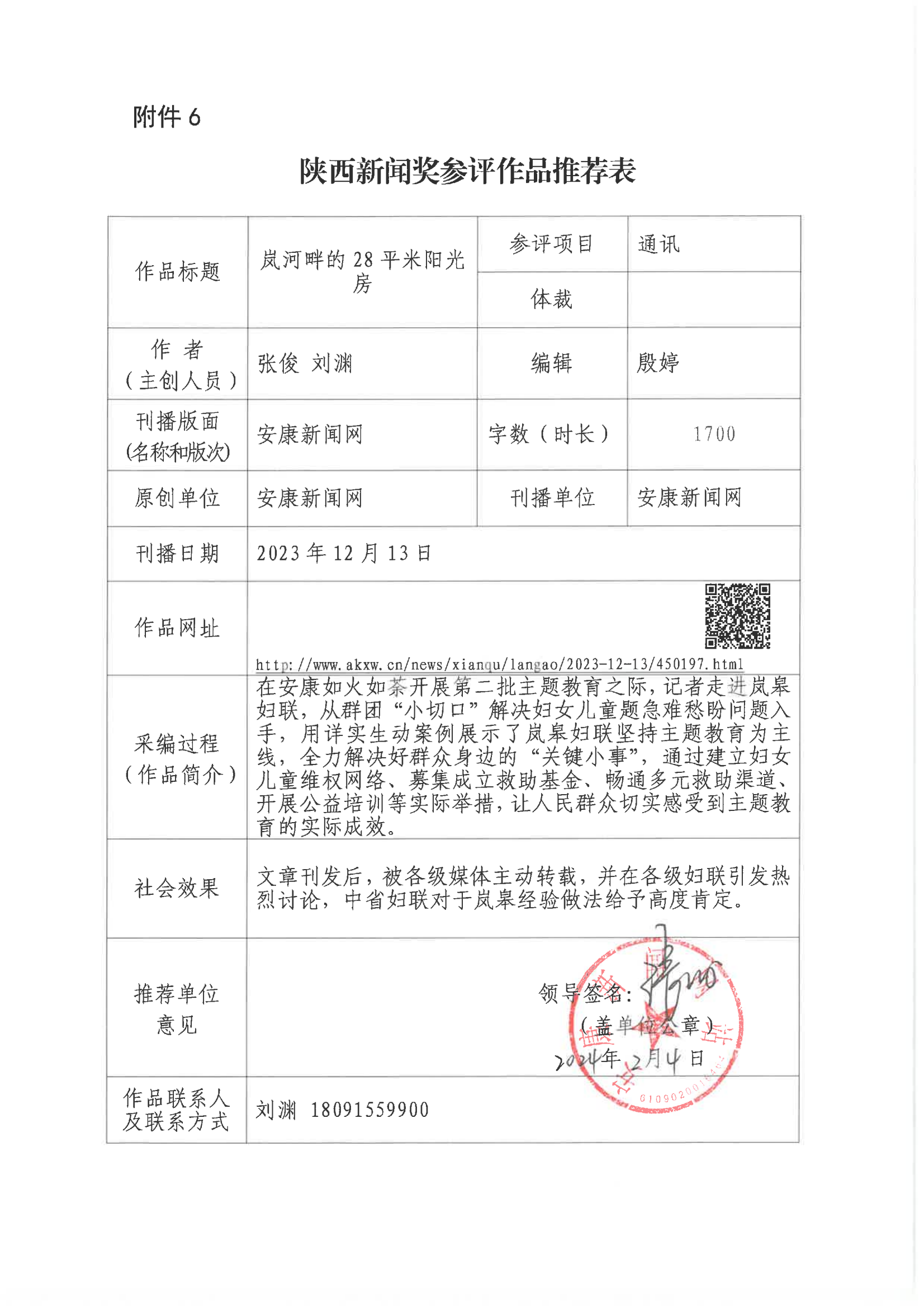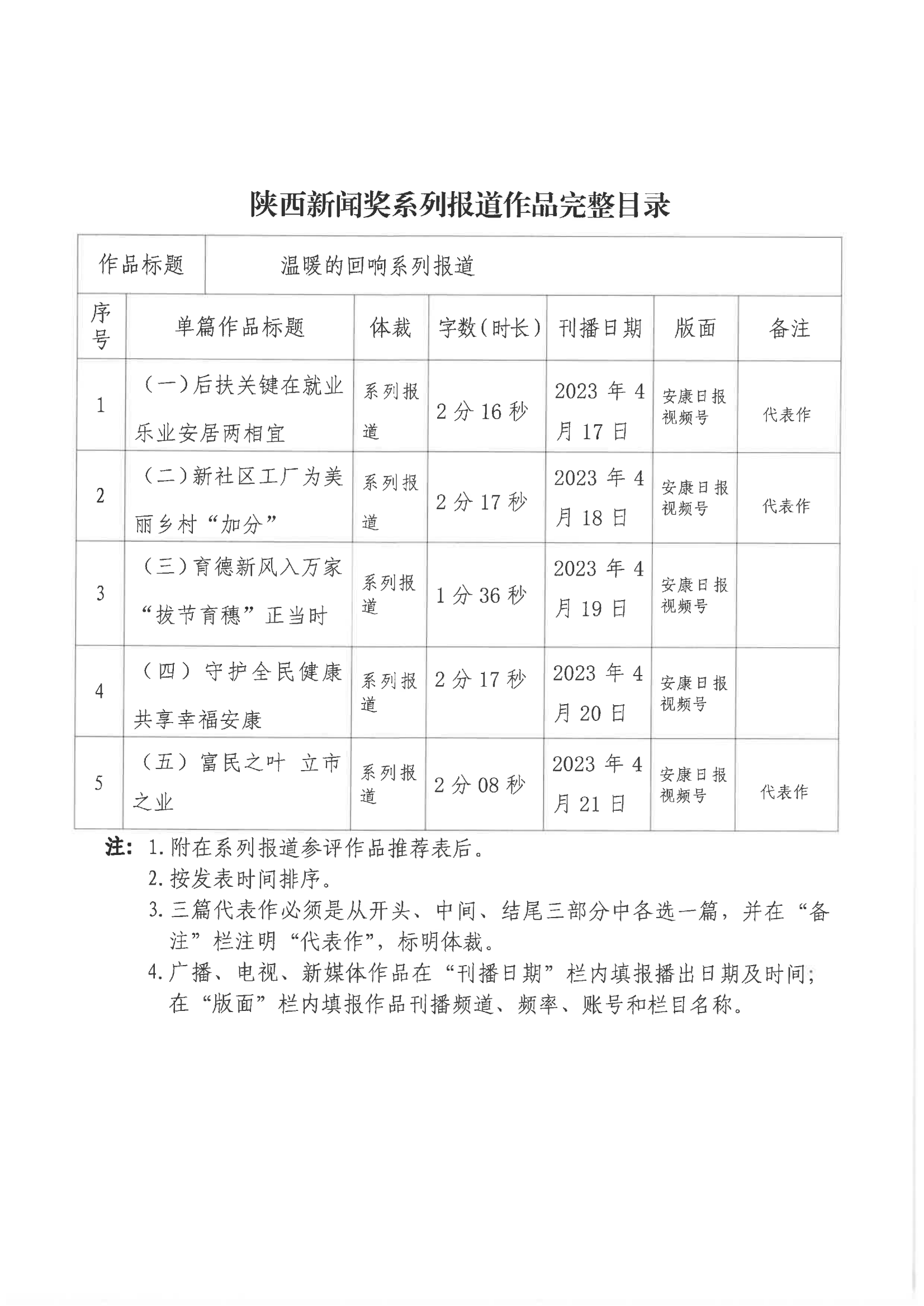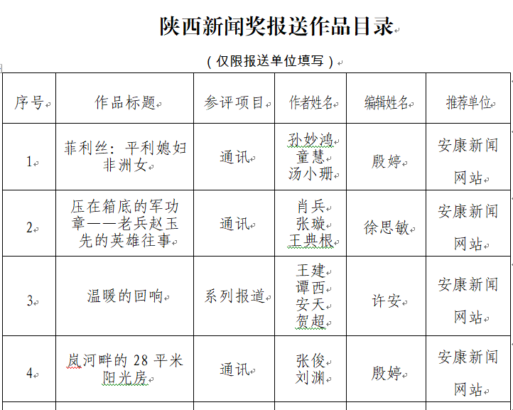 經(jīng)過1月30日編委會推薦、社黨委研究決定,擬推薦以下4件新聞作品參評2023年度“陜西新聞獎(jiǎng)”。公示時(shí)間從2024年3月6日至2024年3月12日,公示期為5個(gè)工作日。如有不同意見,請向安康日報(bào)社機(jī)關(guān)紀(jì)委、新聞管理部反映。