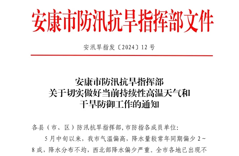 6月12日,安康市防汛抗旱指揮部發(fā)布《關(guān)于切實(shí)做好當(dāng)前持續(xù)性高溫天氣和干旱防御工作的通知》。