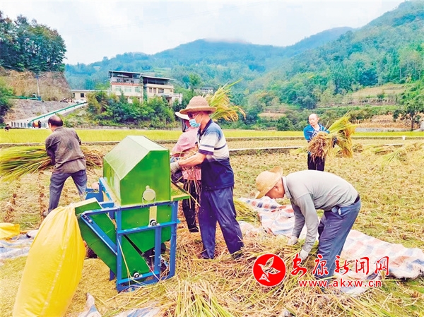 這邊,村民們忙著收割、搬運、脫粒,田壟里機械轟鳴,一派忙碌。旁邊堰渠里,一群群稻花魚在水下游弋嬉戲,往來追逐,不時有魚兒躍出水面,閃著銀波,攪起一圈圈漣漪,吸引了三三兩兩的游人來打卡拍照,暢享這充滿自然之美的田園景色。
