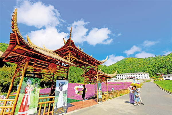 中秋節(jié)期間,平利千家坪森林公園天書(shū)峽馬鞭草花競(jìng)相怒放。如畫(huà)的景色吸引眾多游客前來(lái)賞景打卡。(詹永桂 攝)
