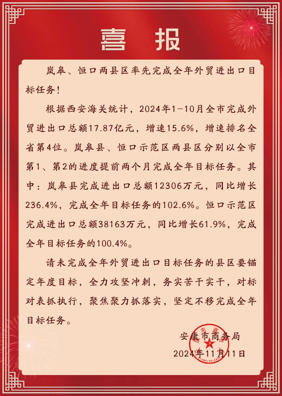 ?近日,市商務(wù)局發(fā)來喜報,恒口示范區(qū)率先完成全年外貿(mào)進(jìn)出口目標(biāo)任務(wù)。
