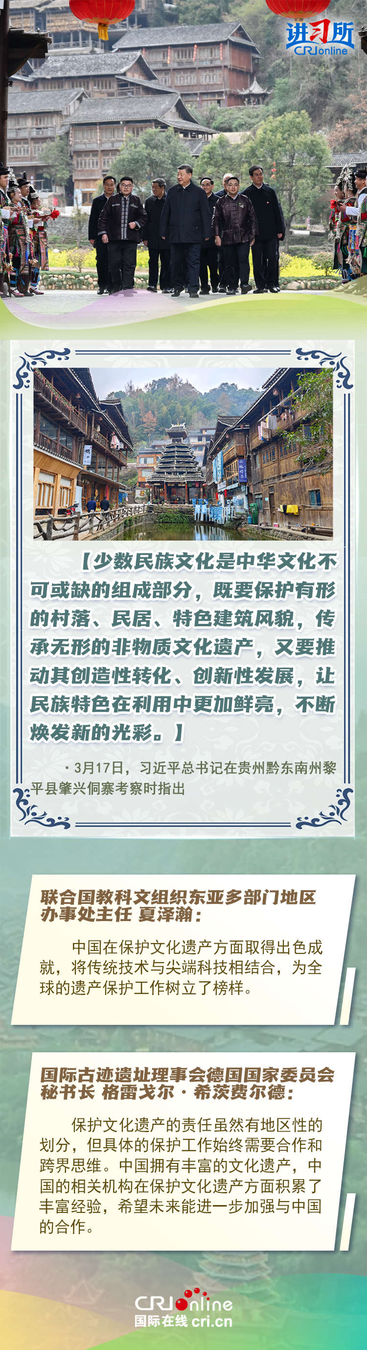 習(xí)近平總書(shū)記近日赴貴州、云南考察。他走進(jìn)民族特色村寨、歷史文化古城,心系歷史文化遺產(chǎn)保護(hù)和文旅融合發(fā)展。習(xí)近平特別叮囑當(dāng)?shù)毓賳T和群眾,既要保護(hù)有形的村落、民居、特色建筑風(fēng)貌,傳承無(wú)形的非物質(zhì)文化遺產(chǎn),又要推動(dòng)其創(chuàng)造性轉(zhuǎn)化、創(chuàng)新性發(fā)展。