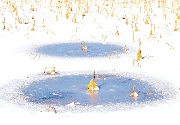 我的攝影創(chuàng)作圍繞生命的痕跡、時間的隱喻兩個主題。在《嘉實擷芳·野圃瑤音》中,菜園的微觀生態(tài)被賦予交響樂般的節(jié)奏——葫蘆藤的螺旋曲線是生命的律動,西紅柿根莖的垂直排列是生長的秩序,蚜蟲蝕痕的細節(jié)則暗喻生態(tài)的共生與抗爭。而在《澄漪棹影·沙月溯光》里,榮成海岸的冬夏對比成為時間的隱喻,結冰湖面上的凋敗蓮蓬是流逝凝固的時光,夏日海邊的金色水洼則是流動的永恒。我癡迷于捕捉這種矛盾與共生——就像用冷暖色調碰撞出畫面的張力,也用虛實構圖處理每一張照片,期待每一張照片是個性鮮明,讓人耳目一新。