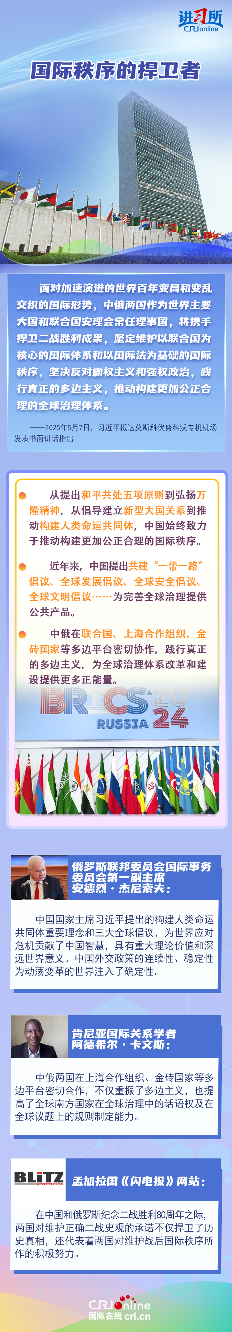 “兩國人民用鮮血和生命凝結(jié)的深厚情誼,如黃河之水奔騰不息,似伏爾加河寬廣深沉,成為中俄世代友好的不竭源泉。”今年是中國人民抗日戰(zhàn)爭、蘇聯(lián)偉大衛(wèi)國戰(zhàn)爭暨世界反法西斯戰(zhàn)爭勝利80周年,也是聯(lián)合國成立80周年。在這一重要?dú)v史時(shí)間節(jié)點(diǎn),習(xí)近平主席此訪不僅為中俄關(guān)系發(fā)展注入強(qiáng)勁動力,也向世界宣示中俄兩國攜手捍衛(wèi)二戰(zhàn)勝利成果的堅(jiān)定意志。