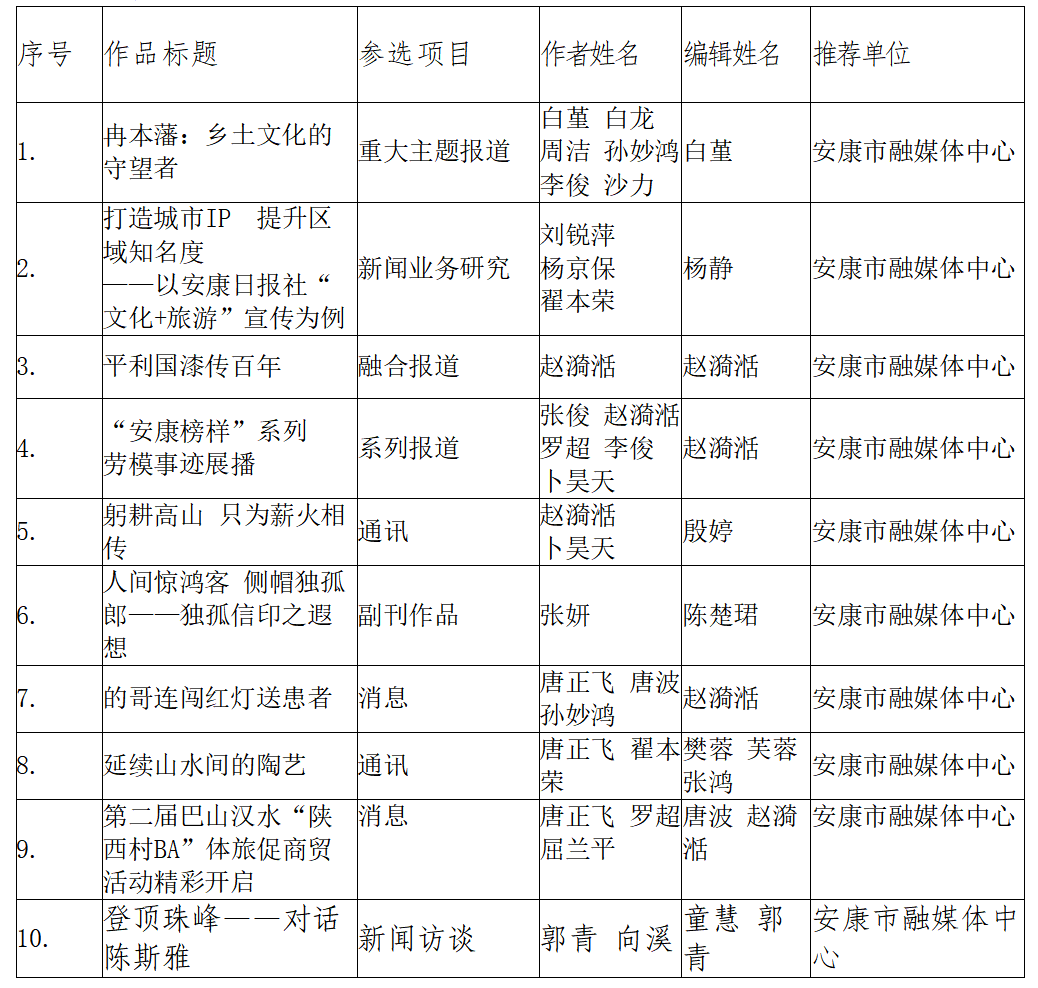 附件:安康優(yōu)秀新聞作品報(bào)送目錄(補(bǔ)充)(共計(jì)10件)