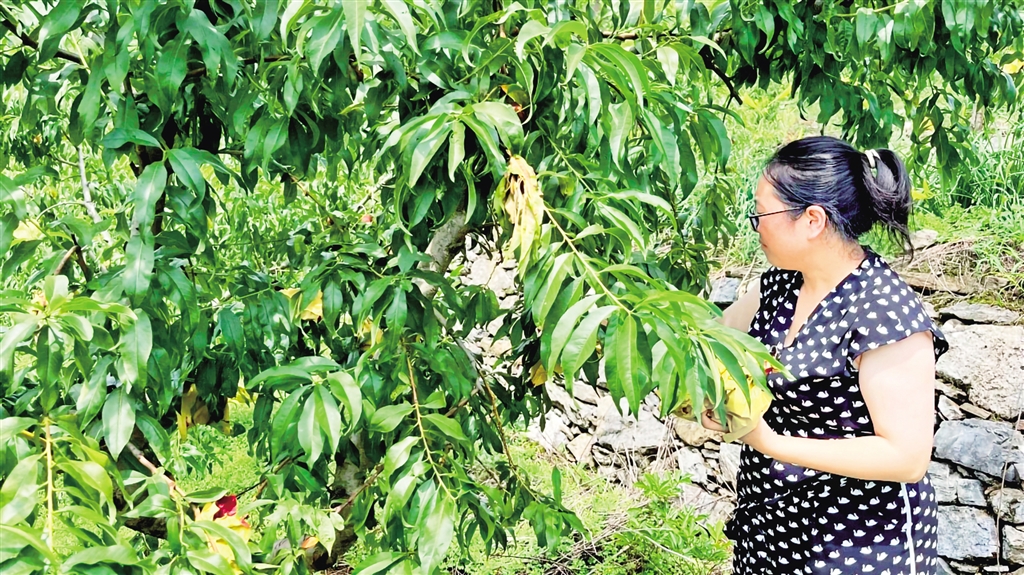 穿過村莊,山坡上500畝桃園綠意盎然。基地負(fù)責(zé)人伍娟與工人正采摘套袋。“2017年建設(shè)的桃園,今年雖受旱情影響,產(chǎn)量仍達(dá)30萬斤,產(chǎn)值約300萬元。”