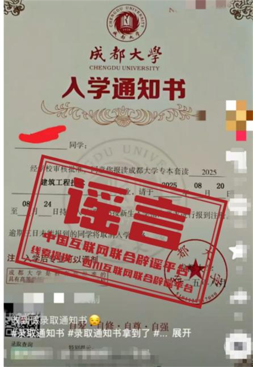 詳情:近日,有考生在網(wǎng)絡社交平臺發(fā)帖稱,未在高考志愿中填報“成都大學”,卻收到了所謂該校的“專本套讀入學通知書”,引起關注。8月19日,成都大學發(fā)布嚴正聲明稱:從未開展“專本套讀”形式的學歷教育招生,任何以“專本套讀”“自考全日制本科”等名義發(fā)放的所謂“入學通知書”均系偽造,其所宣稱的“入學后可調(diào)劑專業(yè)”與成都大學招生政策完全不符。