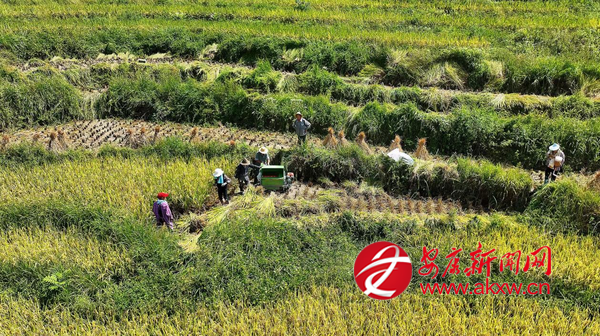 金秋時節(jié),漢陰縣鳳堰梯田景區(qū)迎來了一年中最動人的季節(jié)。層層疊疊的梯田上,稻穗低垂、金黃遍野,農(nóng)戶們穿梭其間,描繪出一幅忙碌而喜悅的豐收畫卷。(通訊員 文婷)