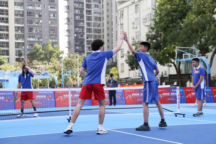 4月15日,在深圳市南山外國語學(xué)校(集團(tuán))高新中學(xué),中美學(xué)生結(jié)對進(jìn)行匹克球雙打比賽。新華社記者 梁旭 攝