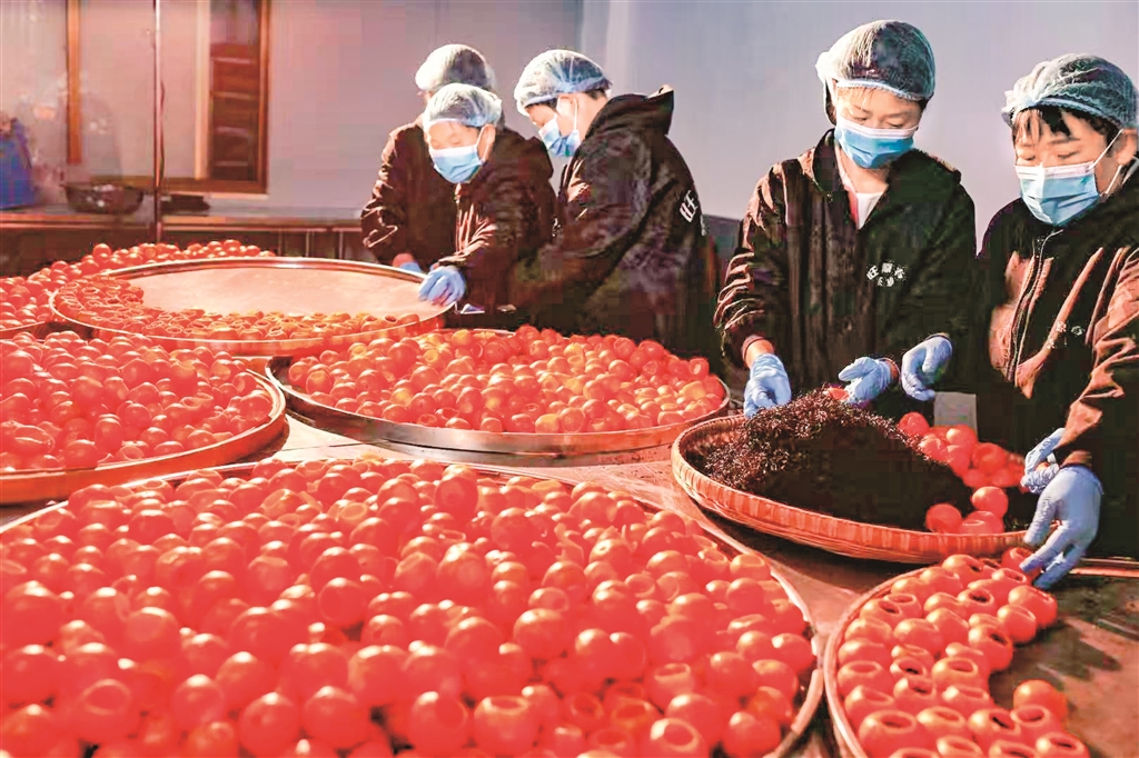 生產(chǎn)車間內(nèi),工人們動作嫻熟,選果、清洗、開蓋、掏挖果肉、填茶、烘干……每一道工序都有條不紊。他們大都是附近的村民,本是茶葉生產(chǎn)的淡季,如今卻因?yàn)樾¢俨枳兂闪嗽鍪盏耐尽?/p>