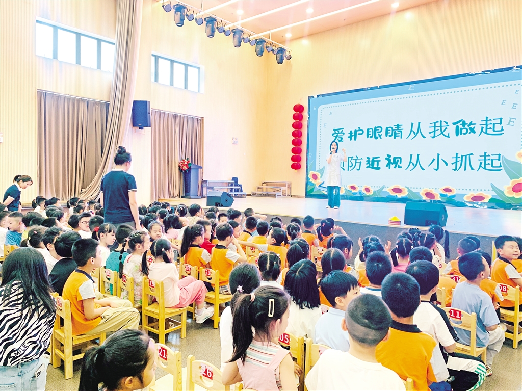 今年6月6日是全國第30個“愛眼日”。在愛眼日來臨之際,6月5日下午,市婦幼保健院兒童保健科醫(yī)生陳興芳走進安康市高新區(qū)第六幼兒園,為大班幼兒及老師帶來近視防控知識講座。陳興芳以眼睛的謎語開場,用通俗易懂的語言向孩子們介紹了眼睛的結(jié)構(gòu)和功能,并通過生動的科普向小朋友們介紹了如何正確用眼、保護視力以及手衛(wèi)生的方法。通過此次活動,不僅讓孩子們了解了眼睛的重要性,更提高了孩子們愛護眼睛的意識。(鄒春艷 攝)