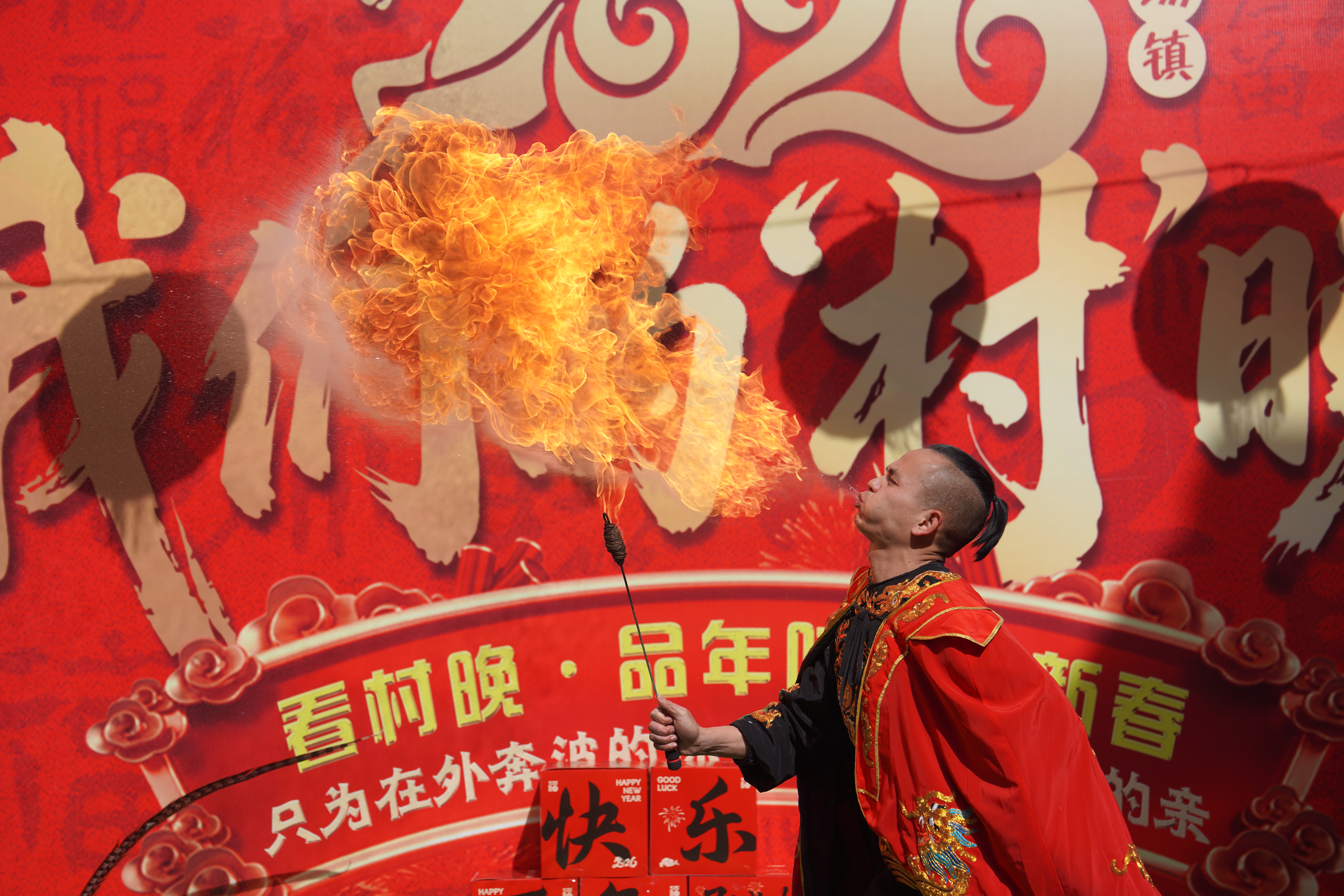△ 2月2日,演職人員在新場鎮(zhèn)“村晚”舞臺(tái)上進(jìn)行特技表演。