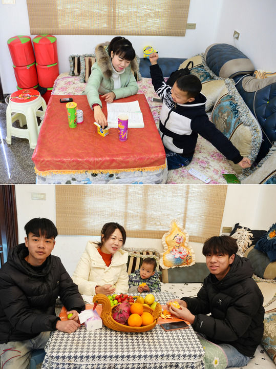 拼版照片:上圖為安康市紫陽(yáng)縣蒿坪鎮(zhèn)黃金村村民雷潔(左)在易地搬遷后的新家中給大兒子張明澤輔導(dǎo)功課(2017年2月9日攝);下圖為雷潔(左二)和她的大兒子張明澤(右一)、二兒子張明懿(左一)、小兒子張翰瑞(右二)在同一地點(diǎn)合影(2026年1月30日攝)。