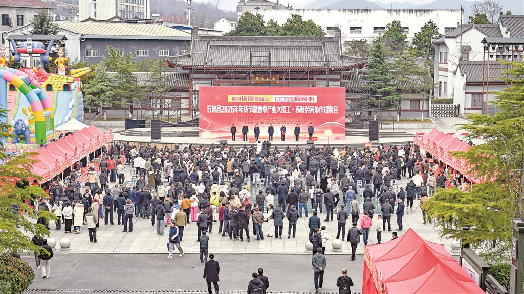 石泉縣2026年年貨節(jié)暨春季產(chǎn)業(yè)大招工·蘇陜勞務(wù)協(xié)作招聘會啟動儀式近日在秦巴風(fēng)情園舉行。本次活動創(chuàng)新融合“春風(fēng)行動”招聘會、年貨節(jié)與文旅促銷,吸引了縣內(nèi)外210余家重點企業(yè)參與,集中提供4500個優(yōu)質(zhì)崗位,旨在促進就業(yè)與消費,助力縣域經(jīng)濟發(fā)展。(董長松 攝)