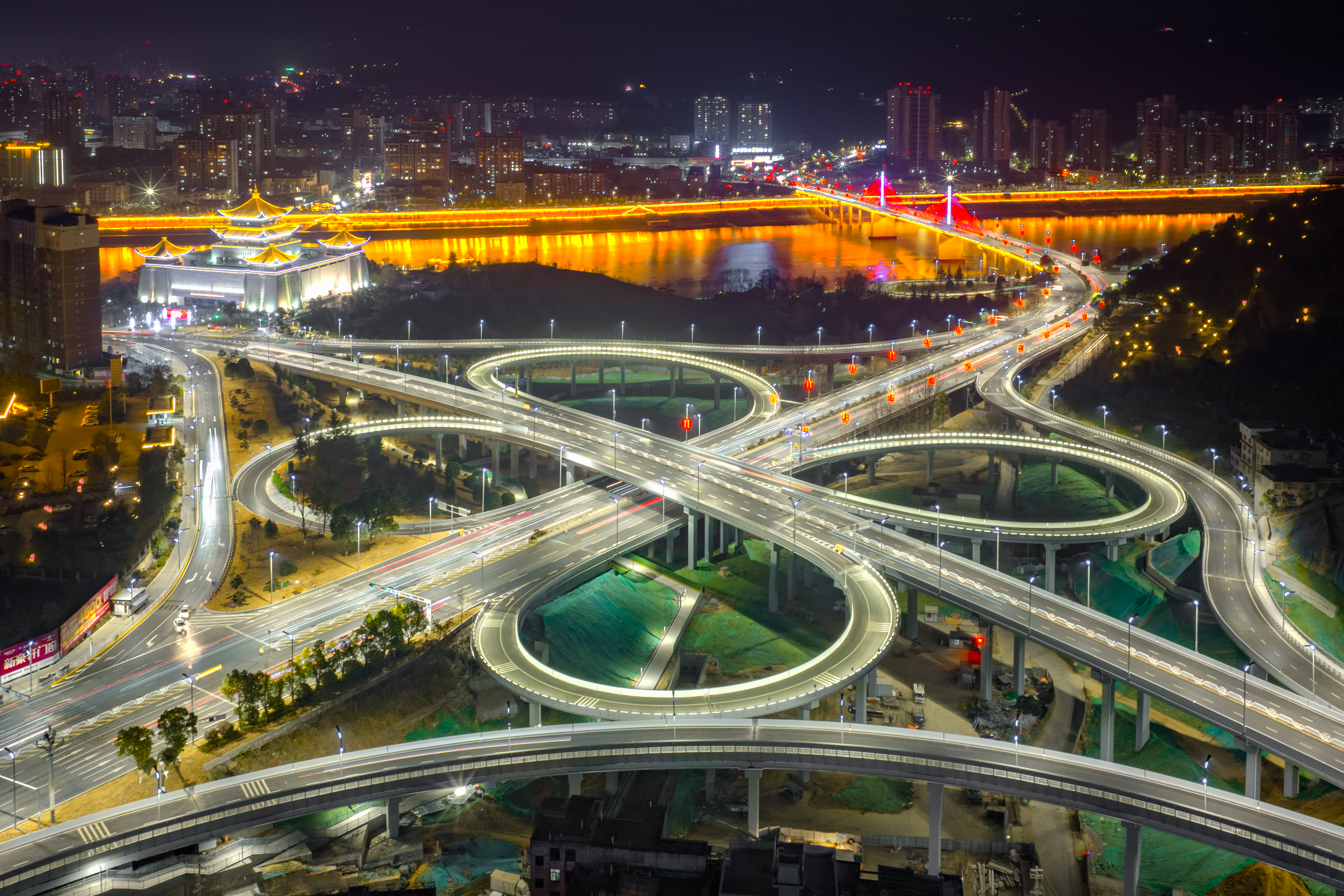 夜晚的七里溝立交,流光溢彩,匝道如銀鏈交織,與漢江粼粼波光彼此輝映,共同勾勒出一幅流動(dòng)的城市發(fā)展畫卷。唐軍 攝