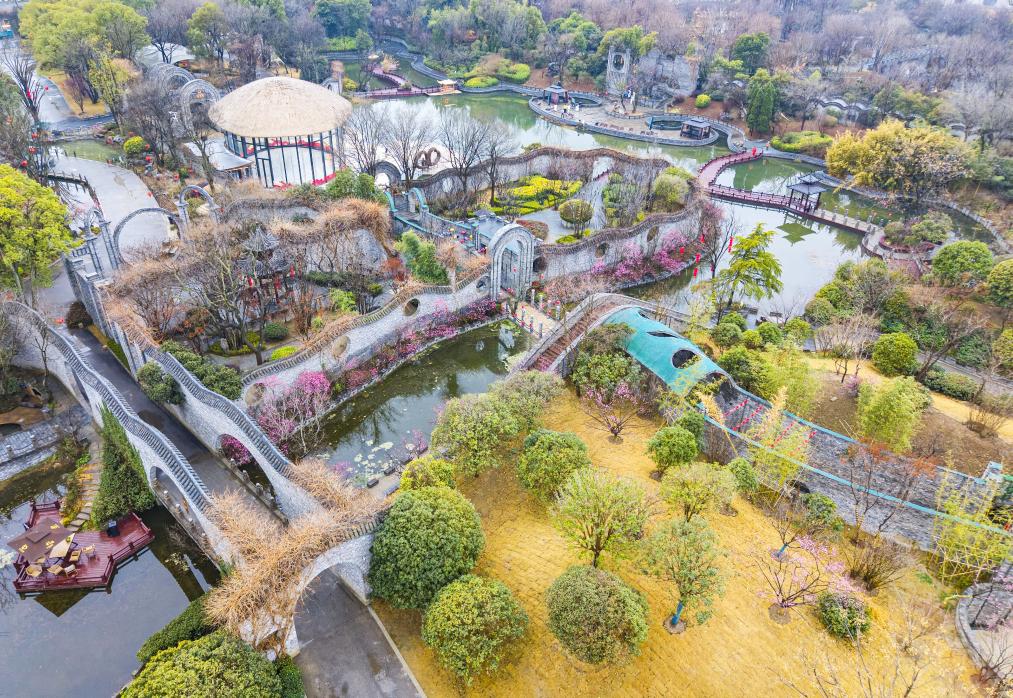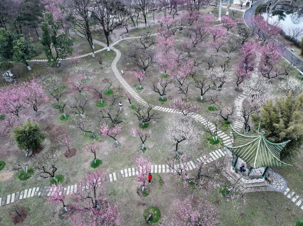 近日,游客在湖北省武漢市青山公園賞花游玩(無(wú)人機(jī)照片)。新華社發(fā)(趙軍攝)