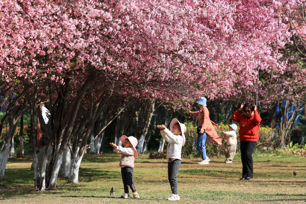 近日,游客在云南省曲靖市沾益區(qū)玉林廣場(chǎng)海棠花樹下賞景游玩。新華社發(fā)(孫文來(lái)攝)
