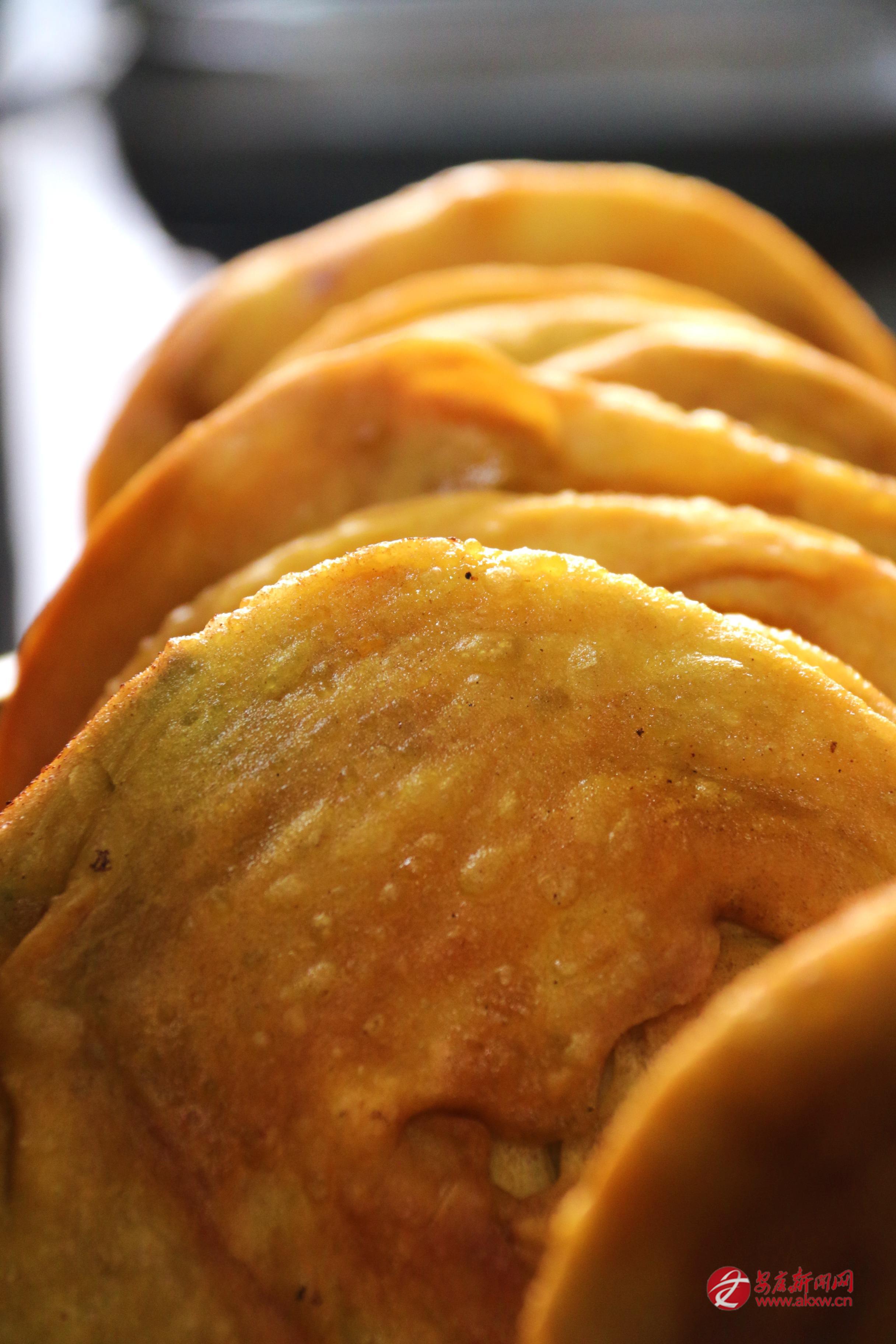煎餅要用平底鍋,油要多,最好能沒過餅的一半。鍋燒熱了,放一點(diǎn)煉過的羊油,那油在鍋底滋滋地化開,香氣就起來了。餅放下去,小火慢煎,不住地翻面。眼看著,餅子慢慢鼓起來,皮兒漸漸金黃,有些地方焦黃了,有些地方還嫩著。起鍋的時候,整個餅子金黃黃的,油光光的,拿在手里燙得很。
