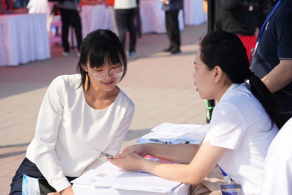 2024年9月25日,求職者(左)在招聘會現場與招聘單位工作人員交流。當日,雄安新區(qū)舉辦2024年河北省畢業(yè)生就業(yè)市場雄安新區(qū)專場招聘會暨河北雄安新區(qū)大型人力資源招聘會。招聘會以“穩(wěn)崗就業(yè) 聚才發(fā)展”為主題,邀請京津冀地區(qū)共157家企業(yè)線下參會,提供就業(yè)崗位4783個。