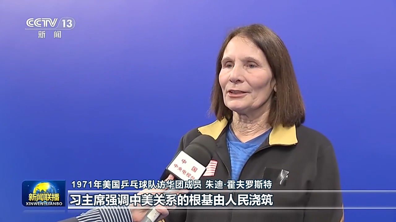 1971年美國乒乓球隊訪華團成員 朱迪·霍夫羅斯特:習主席強調(diào)中美關(guān)系的根基由人民澆筑,這一點我深有感觸。在當下,相互理解與對話比任何時候都更加重要,我也希望我們能將“乒乓外交”精神繼續(xù)傳承,在兩國人民間傳遞溫情,增進理解。