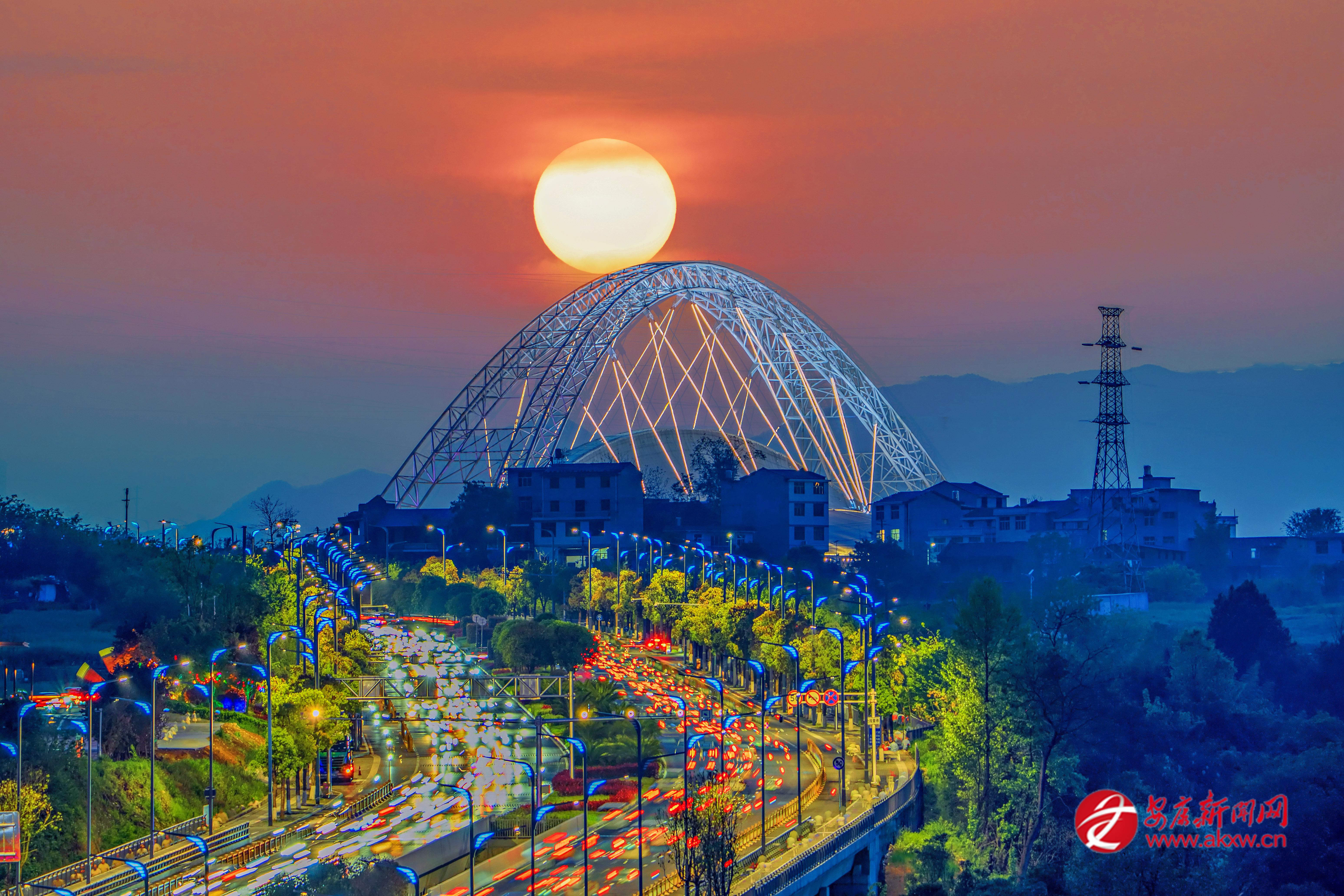 4月9日日落時分,安康市體育館外車流如織,一輪夕陽沉落于體育館穹頂之上,春日晚霞風光令人沉醉。 皮勇維 攝