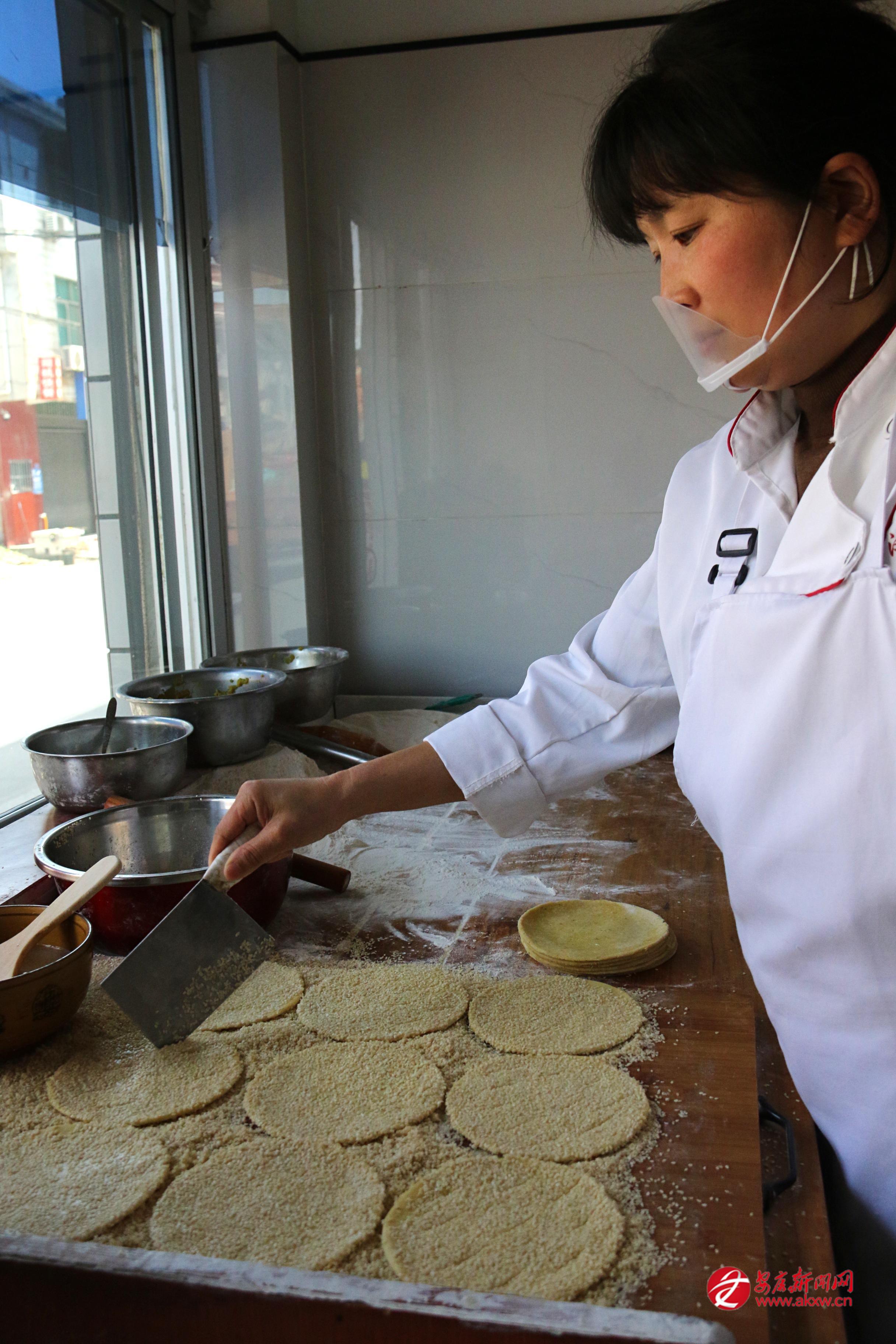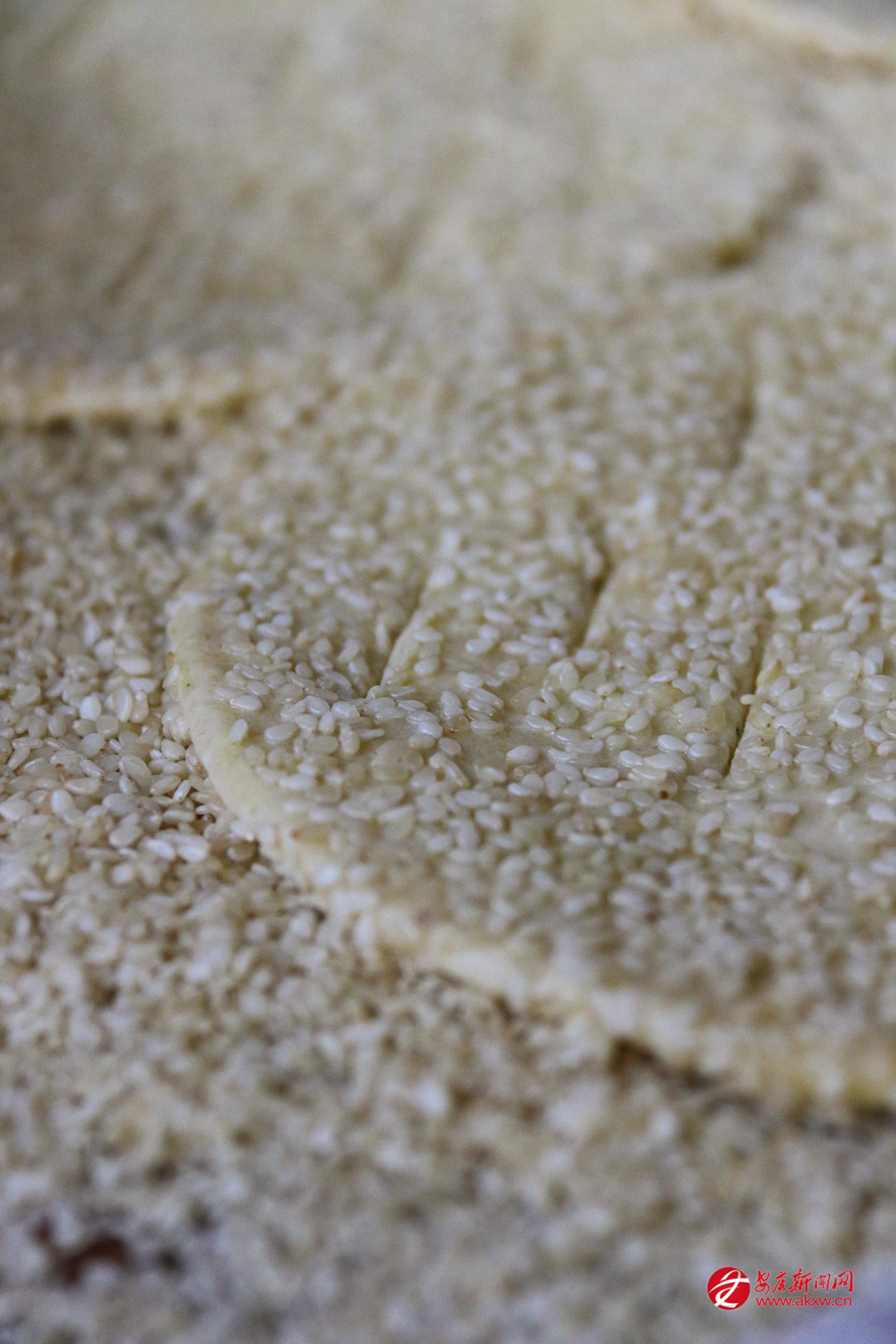 炕炕饃最講究的是“酥”。這酥不是靠油多硬炸出來的,而是用油酥一層一層疊進(jìn)去的。做油酥得用豬油和菜油兩樣,再配上五香粉,小火炒得噴香。面團(tuán)是老面發(fā)的,揉到光潤,再把油酥裹進(jìn)去,搟開,折起,再搟開,反復(fù)好幾回。這時候的面已經(jīng)有了一層層薄薄的紋理,像書頁似的。搟好的餅坯中間薄、四周略厚,抹一層水,粘上白芝麻——可以只粘一面,叫“一面麻”;也可以兩面都粘,叫“二面麻”。然后放進(jìn)一種特制的鐵鏊子里,上下都有炭火,夾著慢慢炕。中間還得翻一兩次身。