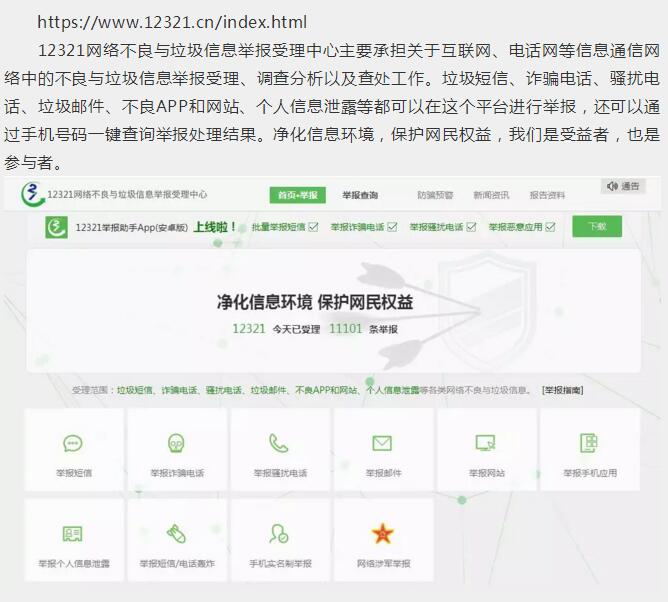 12321網(wǎng)絡(luò)不良與垃圾信息舉報受理中心主要承擔(dān)關(guān)于互聯(lián)網(wǎng)、電話網(wǎng)等信息通信網(wǎng)絡(luò)中的不良與垃圾信息舉報受理、調(diào)查分析以及查處工作。垃圾短信、詐騙電話、騷擾電話、垃圾郵件、不良APP和網(wǎng)站、個人信息泄露等都可以在這個平臺進行舉報,還可以通過手機號碼一鍵查詢舉報處理結(jié)果。凈化信息環(huán)境,保護網(wǎng)民權(quán)益,我們是受益者,也是參與者。